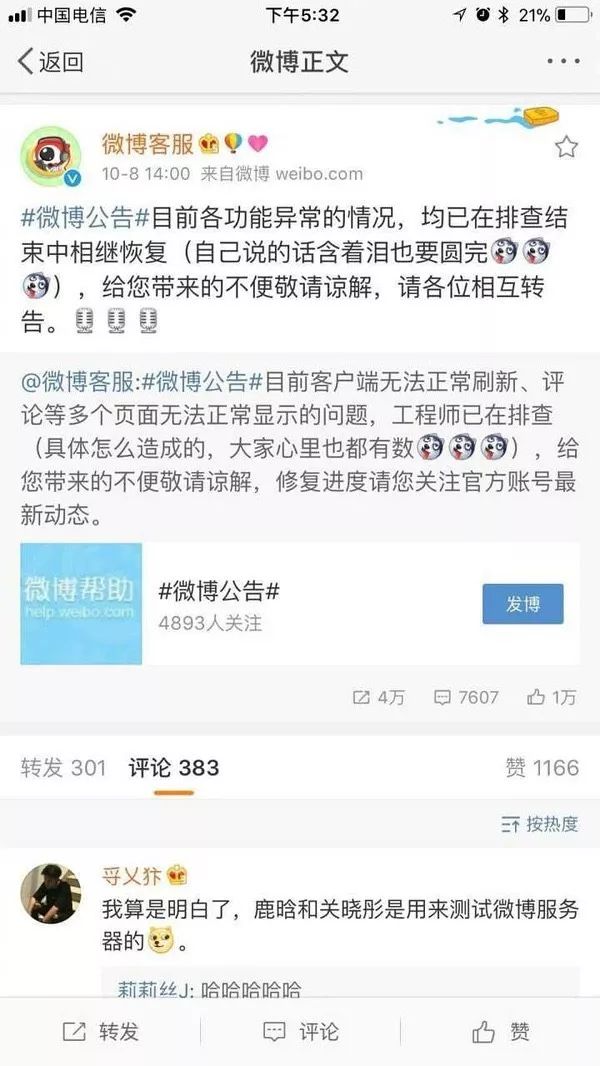 昨天中午十二点鹿晗发布一条新浪微博宣布和关晓彤的恋情,短短几个小时之后,该条微博被转发736137次、评论1913926次、点赞4179888次,短时间内疯狂上涨的数字搞垮了新浪微博的服务器。
