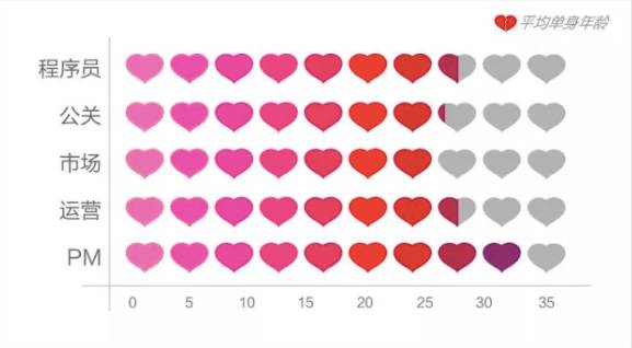 不过,五种互联网职业在单身时间对比图中,程序员则位居榜首了。平均单身时间长达约 13 年,远远高于公关、市场、运营与 PM 的单身时间。