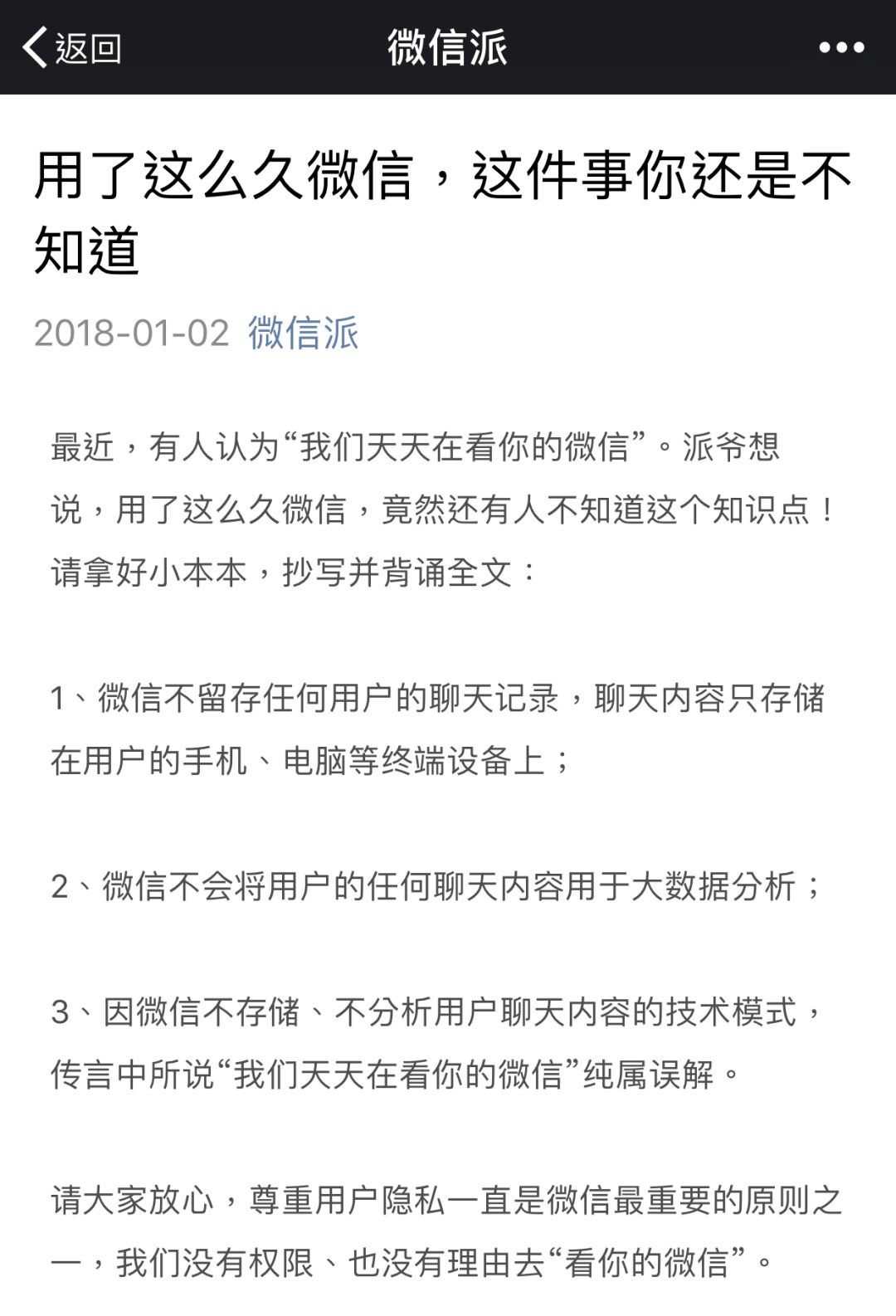 针对近日坊间流传的“我们天天在看你的微信”一说,微信团队于1月2日发表声明重申三条用户隐私原则(详见下图)。