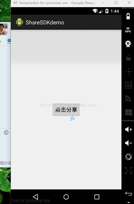 <RelativeLayout xmlns:android="http://schemas.android.com/apk/res/android" xmlns:tools="http://schemas.android.com/tools" android:layout_width="match_parent" android:layout_height="match_parent" tools:context="${relativePackage}.${activityClass}" > <Button android:layout_centerInParent="true" android:onClick="share" android:layout_width="wrap_content" android:layout_height="wrap_content" android:text="点击分享" /> </RelativeLayout>