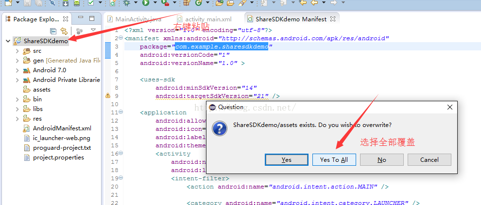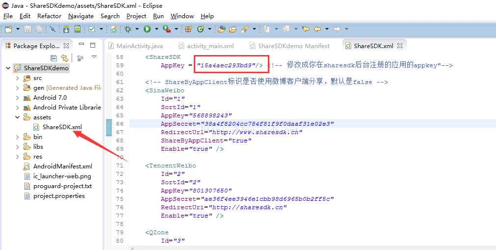 接下来打开目录下的assets下的ShareSDK.xml文件找到AppKey,替换成你自己申请的appKey
