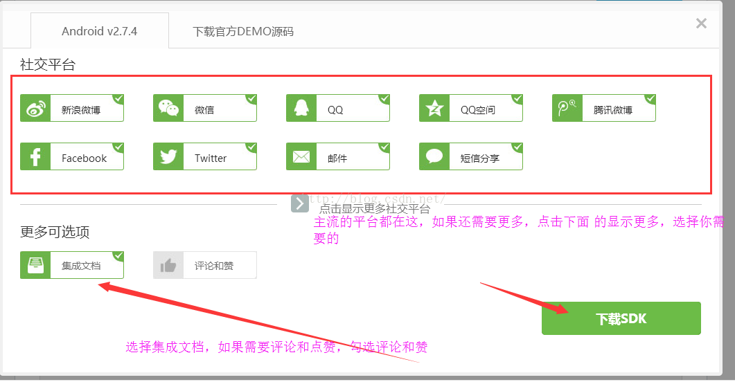 点击SDK下载,弹出下面的的页面,可以根据需求选择分享到的平台,还可以选择点赞和评论,你开心就好!
