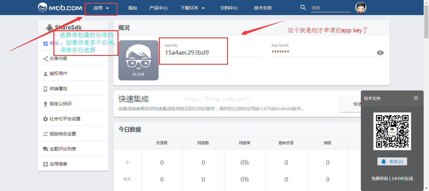 进入到详情的页面,导航栏的进入按钮 是选择不同应用的,如果你创建多个应用,点击选择你想要的应用查看对应的app Key,具体如下: