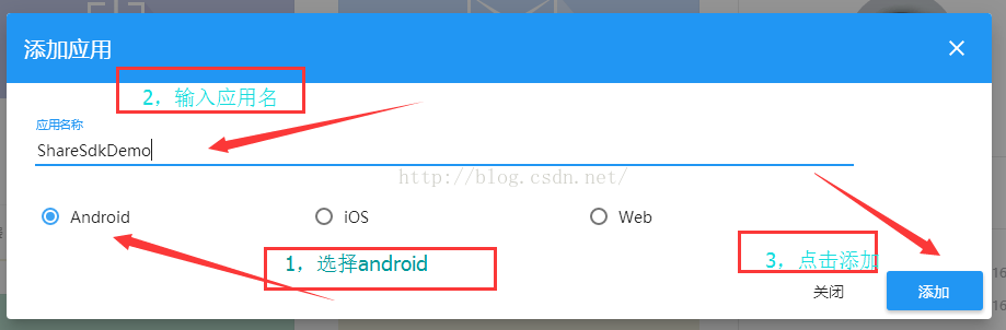 private void showShare() { ShareSDK.initSDK(this); OnekeyShare oks = new OnekeyShare(); //关闭sso授权 oks.disableSSOWhenAuthorize(); // 分享时Notification的图标和文字 2.5.9以后的版本不调用此方法 //oks.setNotification(R.drawable.ic_launcher, getString(R.string.app_name)); // title标题,印象笔记、邮箱、信息、微信、人人网和QQ空间使用 oks.setTitle(getString(R.string.share)); // titleUrl是标题的网络链接,仅在人人网和QQ空间使用 oks.setTitleUrl("http://sharesdk.cn"); // text是分享文本,所有平台都需要这个字段 oks.setText("我是分享文本"); // imagePath是图片的本地路径,Linked-In以外的平台都支持此参数 //oks.setImagePath("/sdcard/test.jpg");//确保SDcard下面存在此张图片 // url仅在微信(包括好友和朋友圈)中使用 oks.setUrl("http://sharesdk.cn"); // comment是我对这条分享的评论,仅在人人网和QQ空间使用 oks.setComment("我是测试评论文本"); // site是分享此内容的网站名称,仅在QQ空间使用 oks.setSite(getString(R.string.app_name)); // siteUrl是分享此内容的网站地址,仅在QQ空间使用 oks.setSiteUrl("http://sharesdk.cn"); // 启动分享GUI oks.show(this);