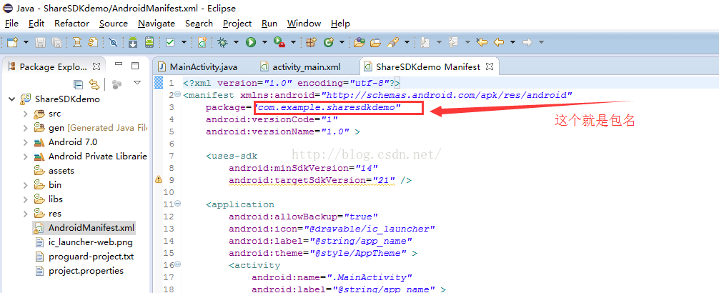 打开eclipse创建一个项目,打开AndroidManifest.xml,记住你的包名