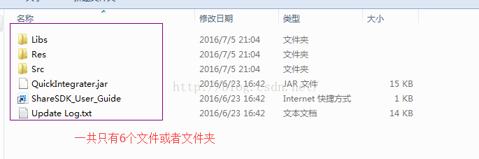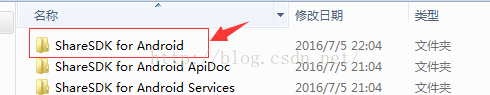 找到你解压后的文件,里面有一个叫ShareSDK for Android的文件,点击ShareSDK for Android进入,注意看里面一共只有6个文件,多一个少一个不要紧,主要是记住有几个