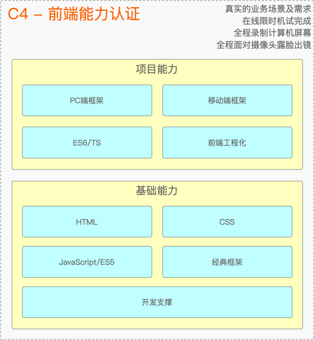 下图是C4—前端能力认证的能力图,项目能力里面包含了PC端框架,框架是进大厂必备的知识技能。