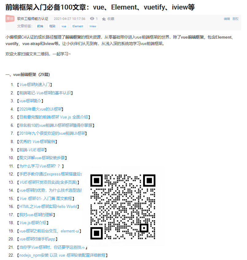 小编根据C4认证的成长路径整理了【前端框架】的最全学习资料100篇,除了vue前端框架,包含Element、vuetify、vue-strap和iview等。扫码添加小助手即可获取~
