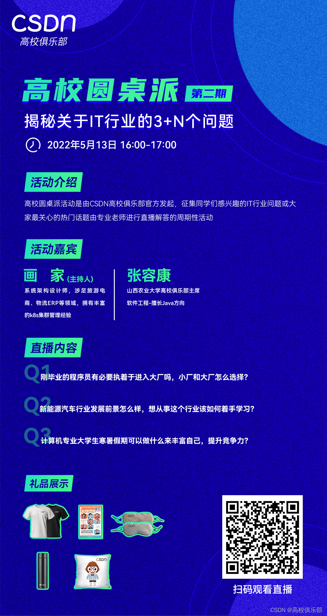 2022年5月13日,优快云高校俱乐部举办了一场直播活动,邀请了专业讲师胡必腾和学生主席张容康,讨论了程序员入职大厂VS小厂的选择、新能源汽车行业前景以及大学生寒假自我提升的方法。参与者可通过直播互动赢取优快云周边礼品。高校圆桌派是优快云为解答同学们在IT行业疑问和热门话题而设立的周期性活动。