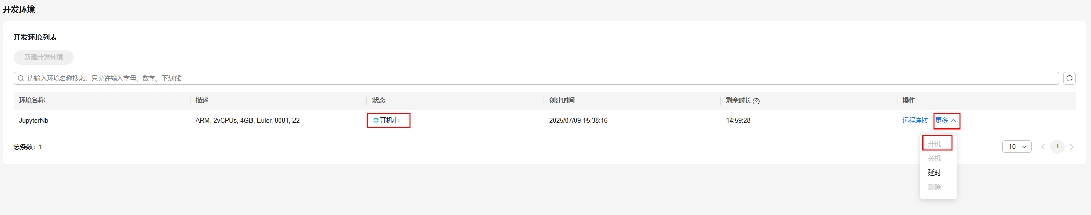 在开发环境列表,JupyterNb开发环境的操作栏点击更多,选择开机。开发环境自动进入开机中状态(耗时1~3分钟,此状态无需任何操作),完成开机后状态栏自动变更为运行中。