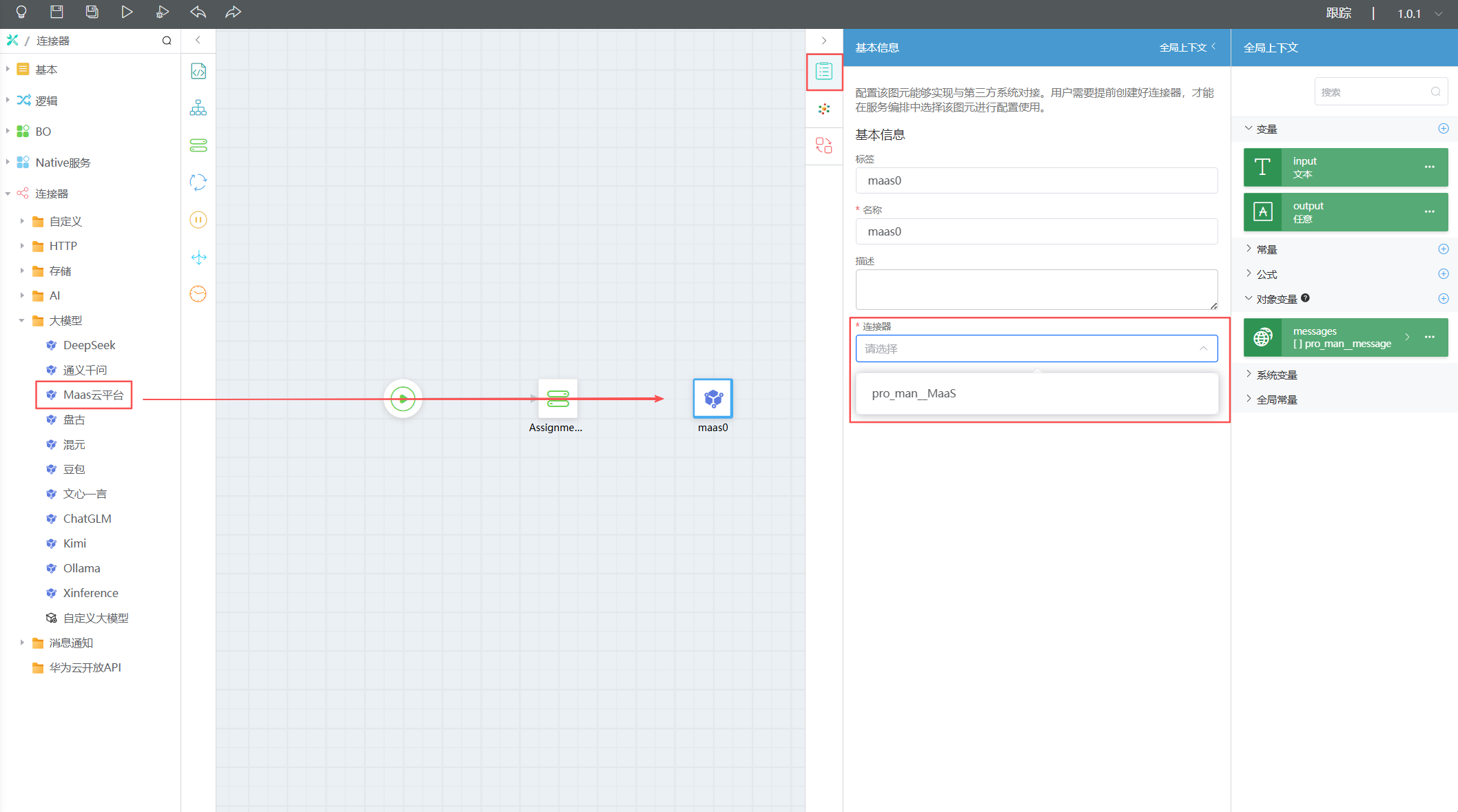在左侧工具栏连接器 > 大模型中找到 MaaS云平台,并将其拖曳到画布中。
