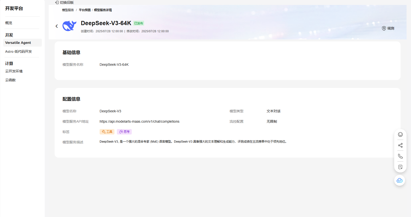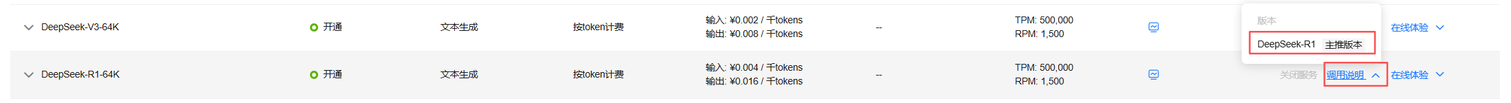 这里拿DeepSeek-V3-64K模型为例,开通完毕后点击调用说明,版本选择主推版本,进入页面后可以看到API地址和model参数。