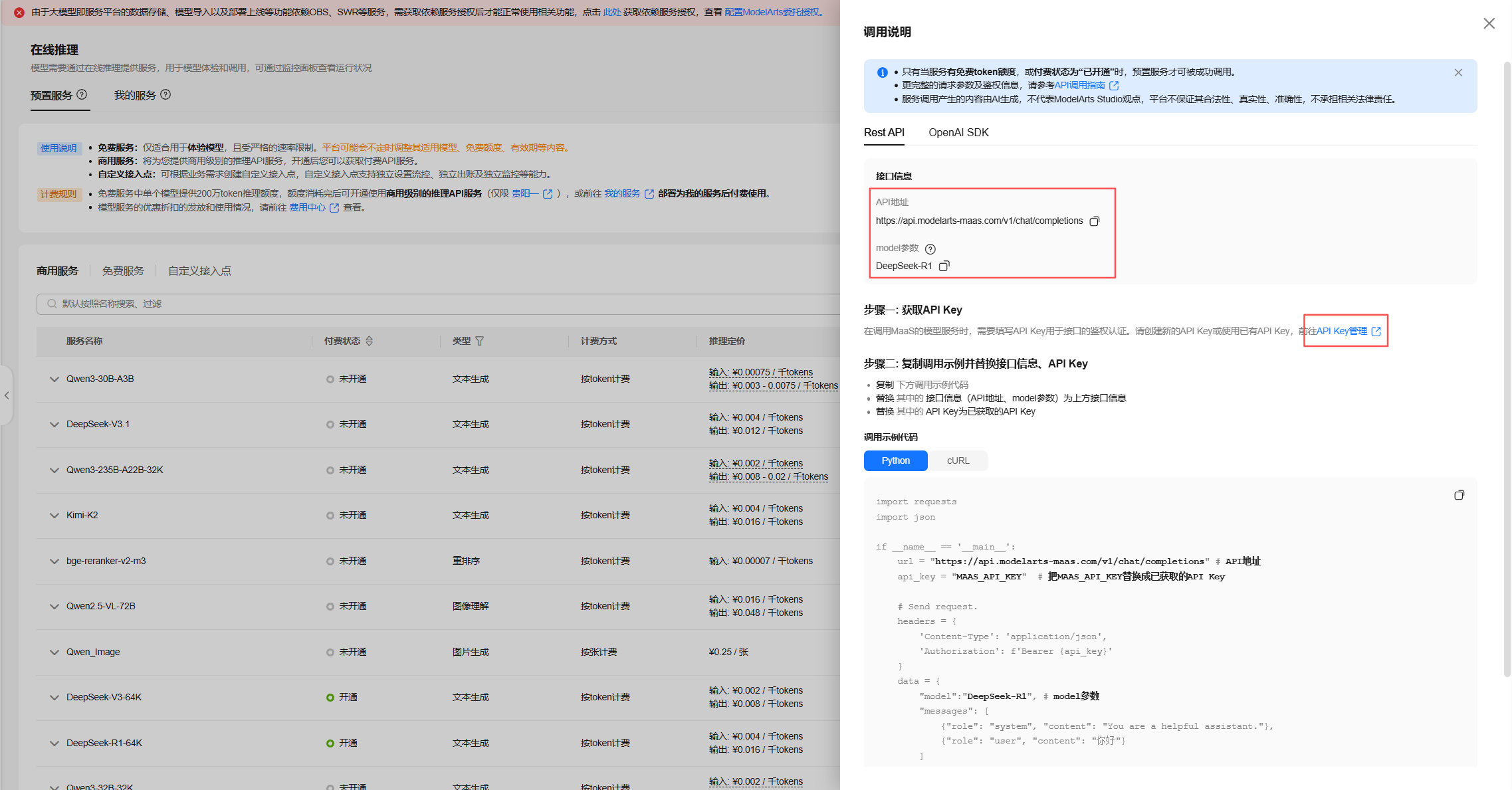 代金券领取并购买套餐完毕后,前往华为云ModelArts Studio(MaaS)平台开通商用模型。本案例中选用更加通用的DeepSeek-V3模型。