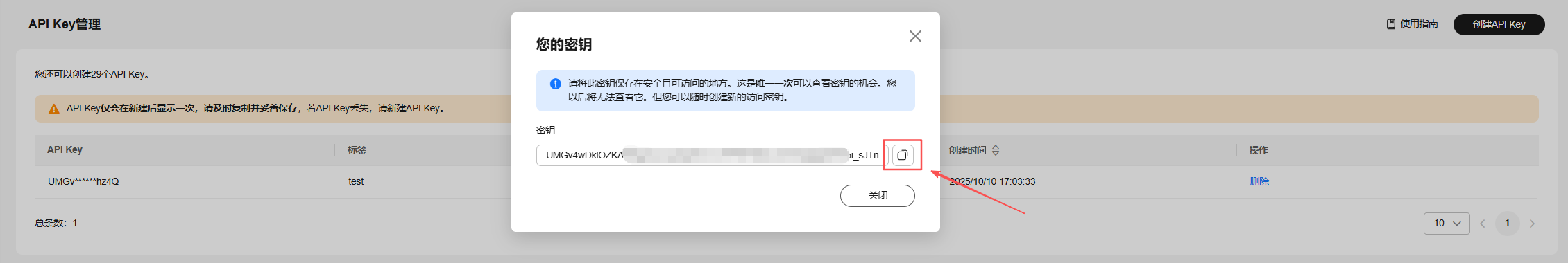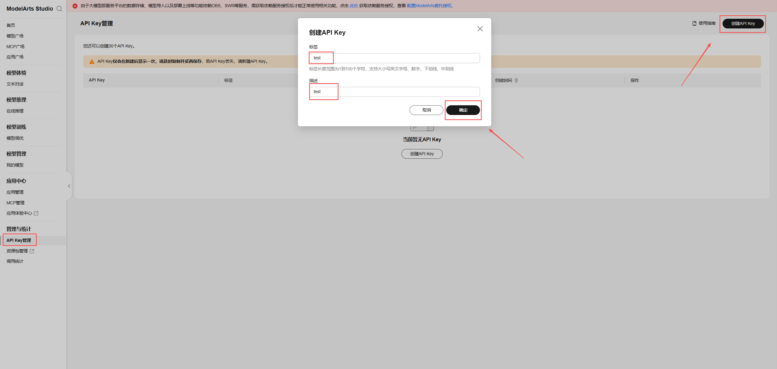 点击API Key管理,进入页面后,点击右上角创建API Key,标签和描述可以自定义,输入完毕后点击创建。(注意:创建好的API Key只会显示这一次,请妥善保存)