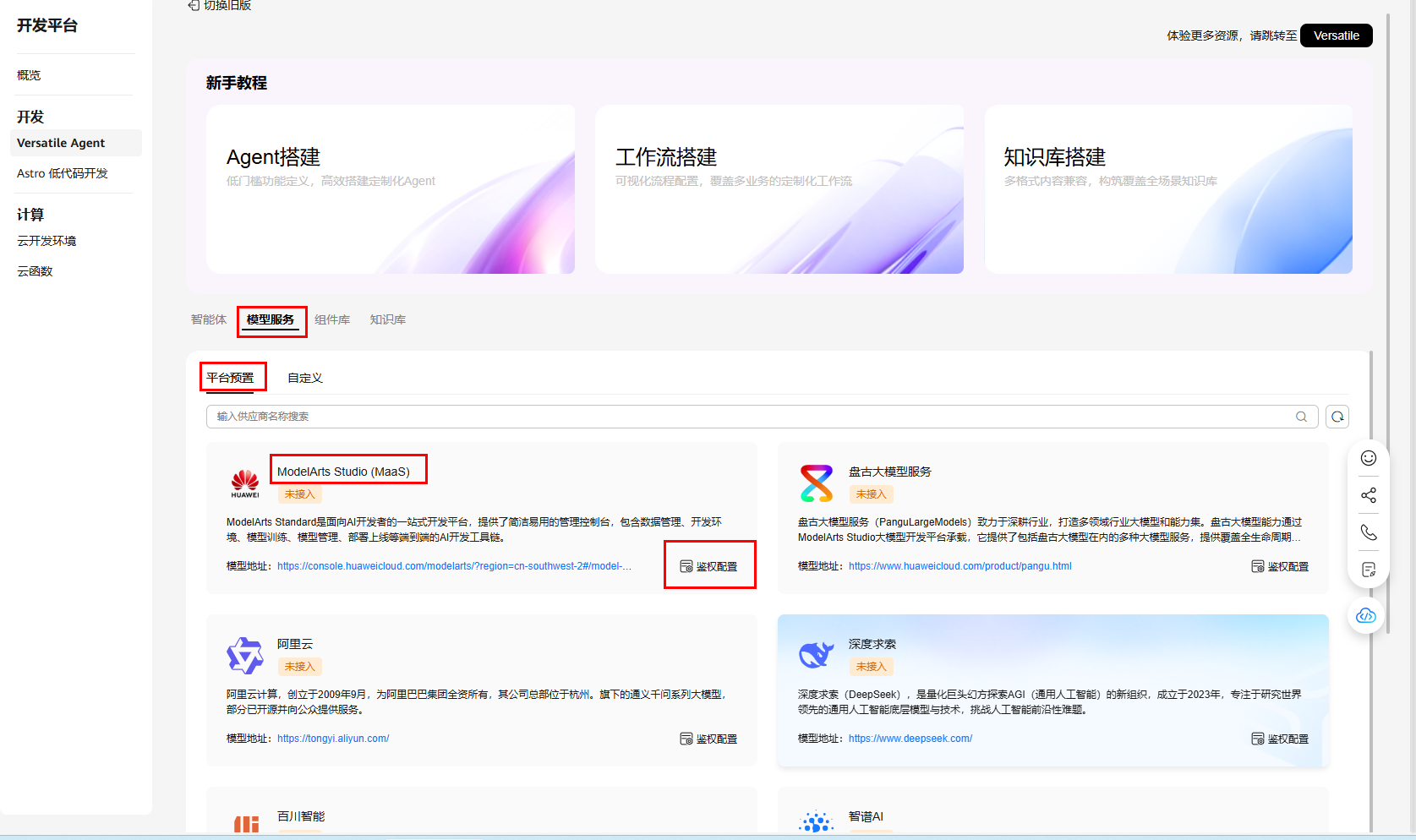 进入到华为开发者空间开发平台Versatile Agent后,点击模型服务 -> 平台预置,找到ModelArts Studio (MaaS)服务商, 点击鉴权配置,输入步骤1.3中获取的API Key。