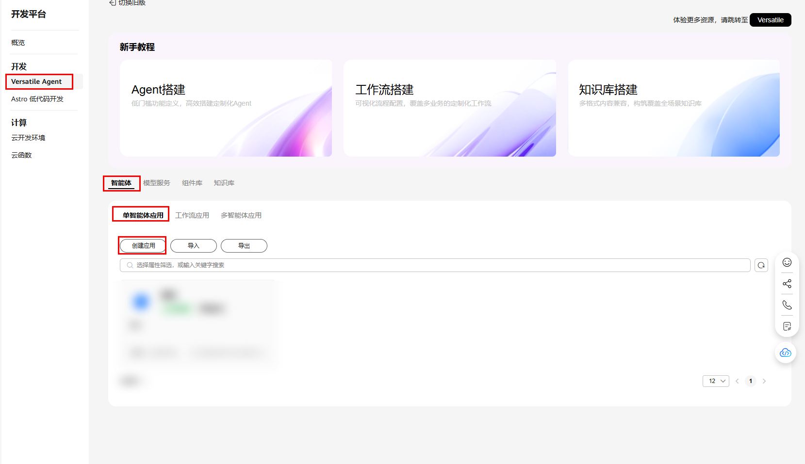 返回Versatile Agent首页,点击智能体 -> 单智能体应用 -> 创建应用,进入智能体创建页面: