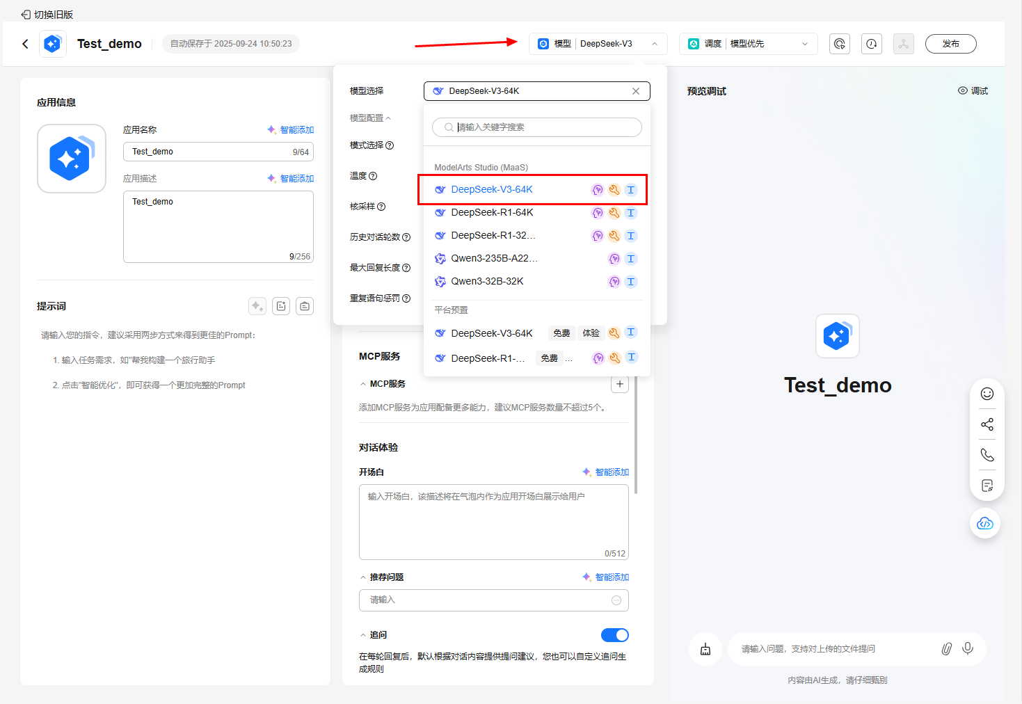 进入应用配置界面,选择目标接入的模型(如:DeepSeek-V3-64K):