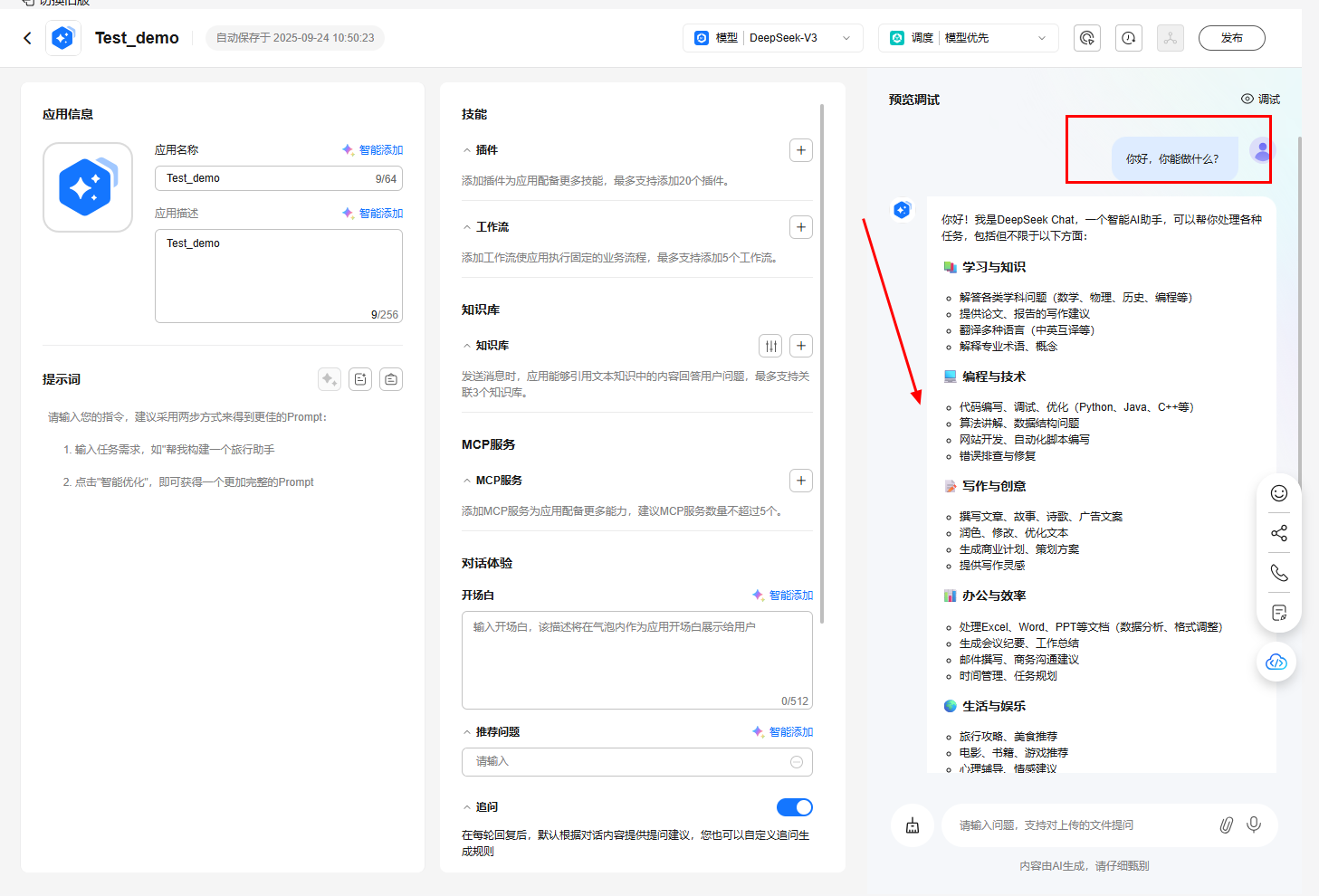 可以看到,Agent可以正常使用了,至此,Versatile Agent中自定义接入大模型配置华为云MaaS指导已全部完成。