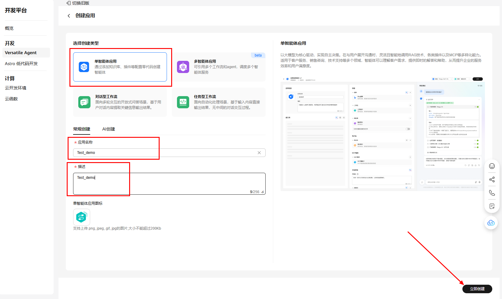 这里创建一个简单的Agent作为演示,Agent名称和描述输入Test_demo,然后点击立即创建: