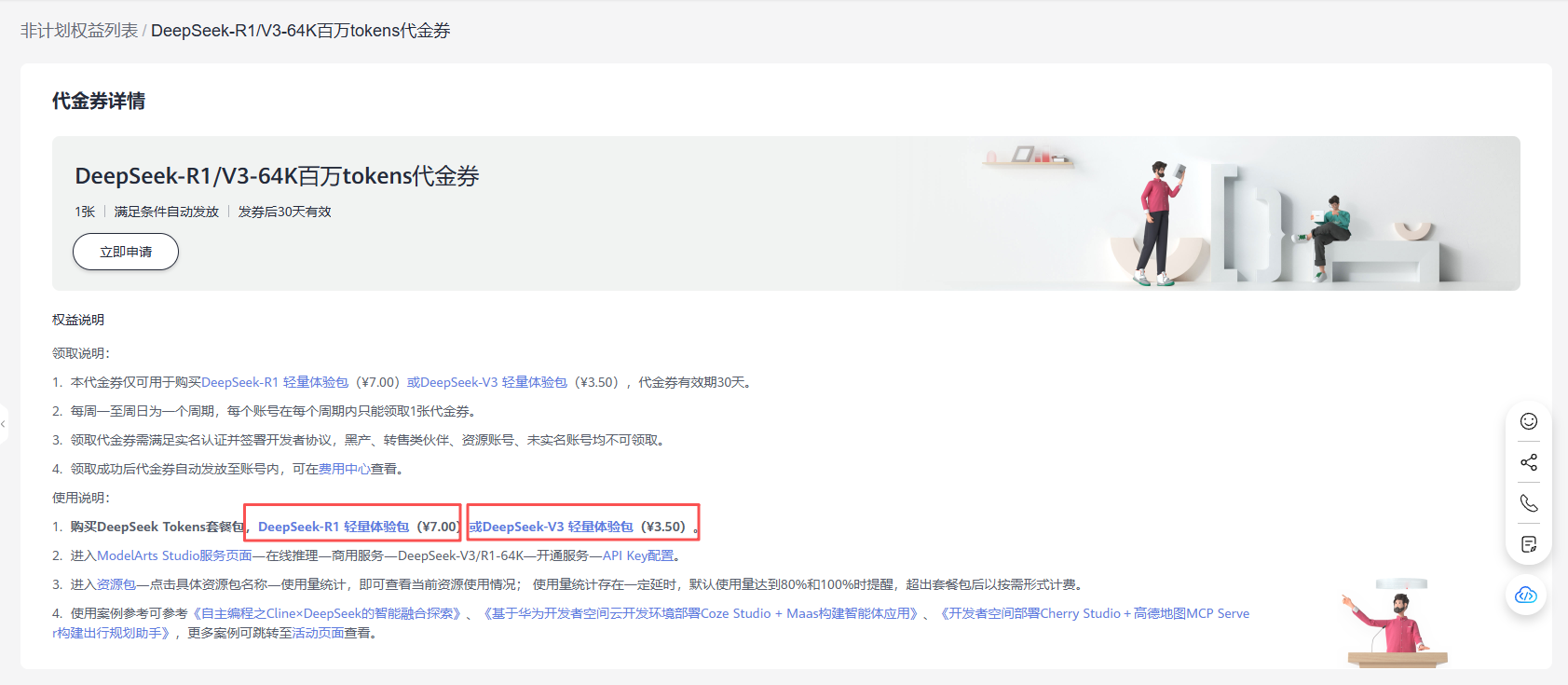 返回代金券详情页面,查看权益说明,本案例选用DeepSeek-V3,点DeepSeek-V3 轻量体验包(¥3.50)。(同理,若其他案例中选用DeepSeek-R1,则在此处点DeepSeek-R1 轻量体验包(¥7.00))