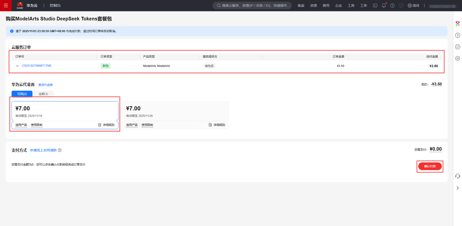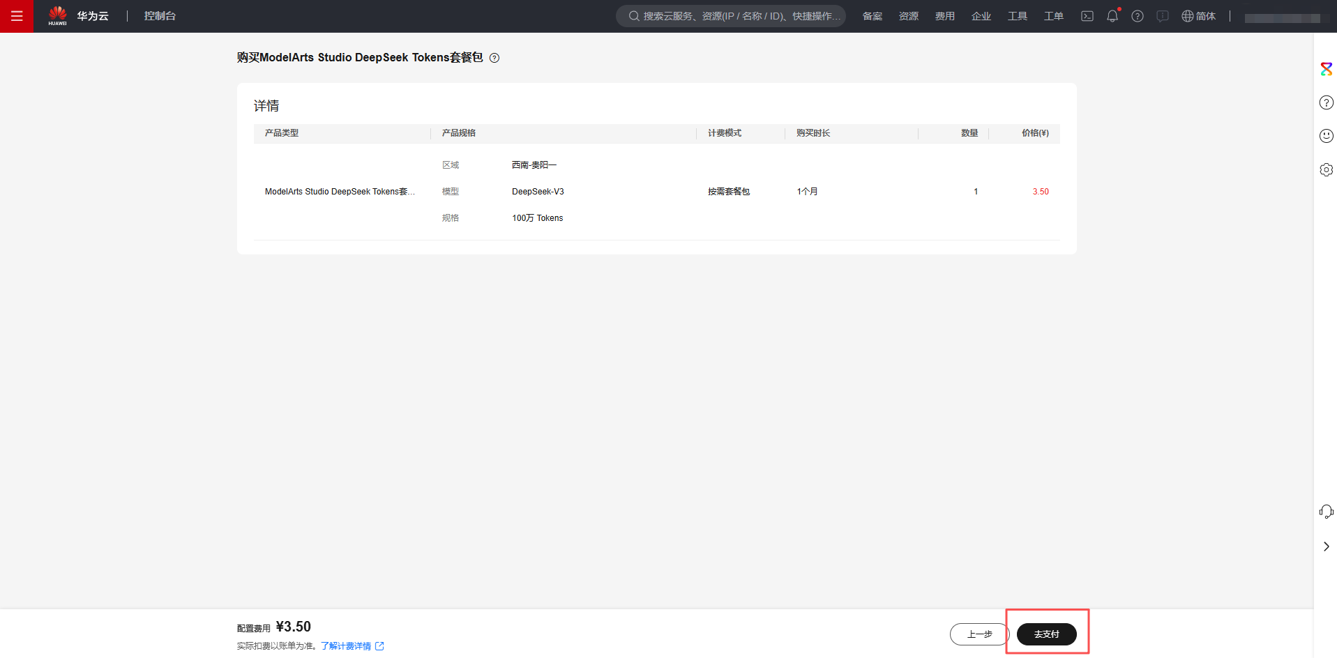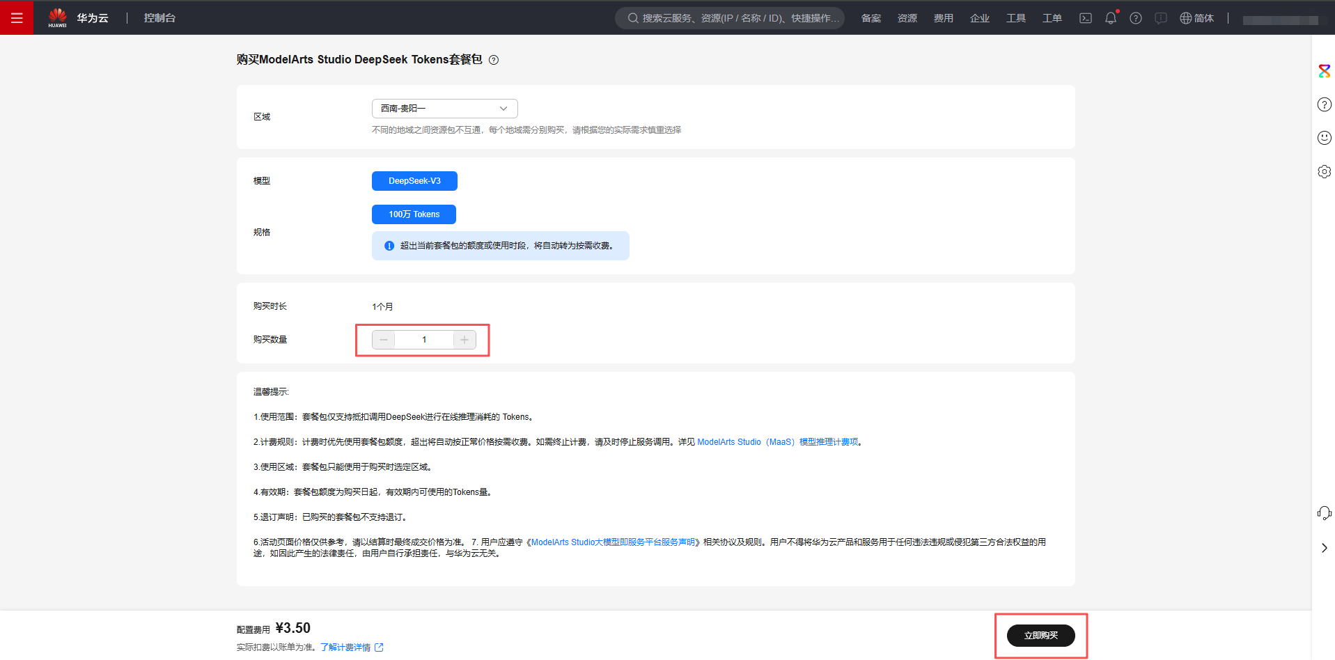 1.2 购买ModelArts Studio DeepSeek Tokens套餐包