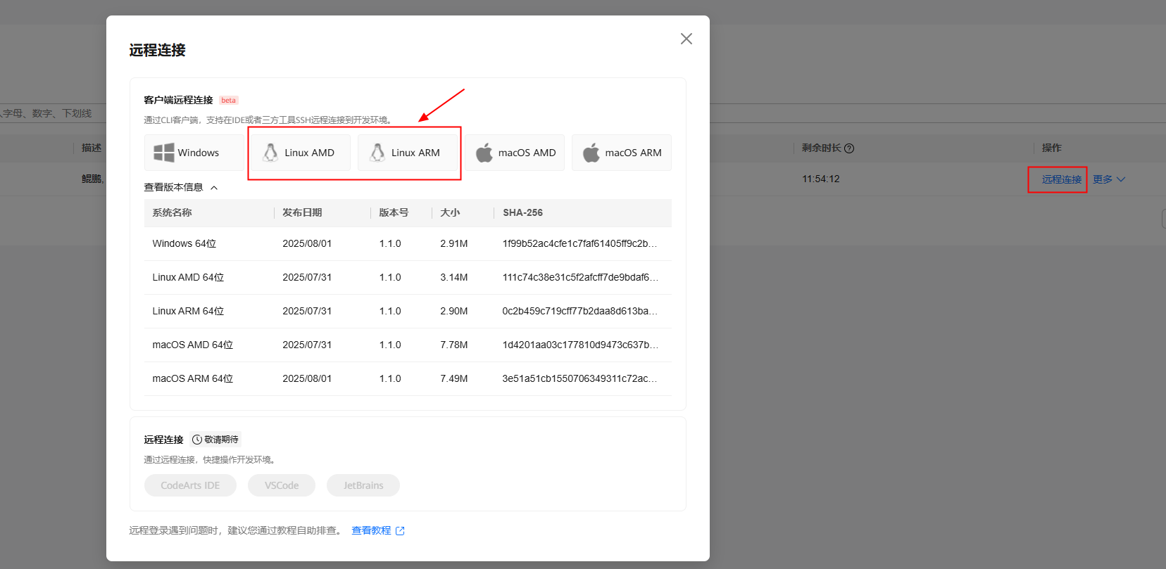 下载 在Web端创建的云开发环境上点击【远程连接】-在弹出框根据自己的Linux系统选择ARM或者AMD版本,点击图标即可将cli工具包下载到本地。 我们当前选择下载Linux的AMD版本,下载之后是一个tar包,无需在本地解压。