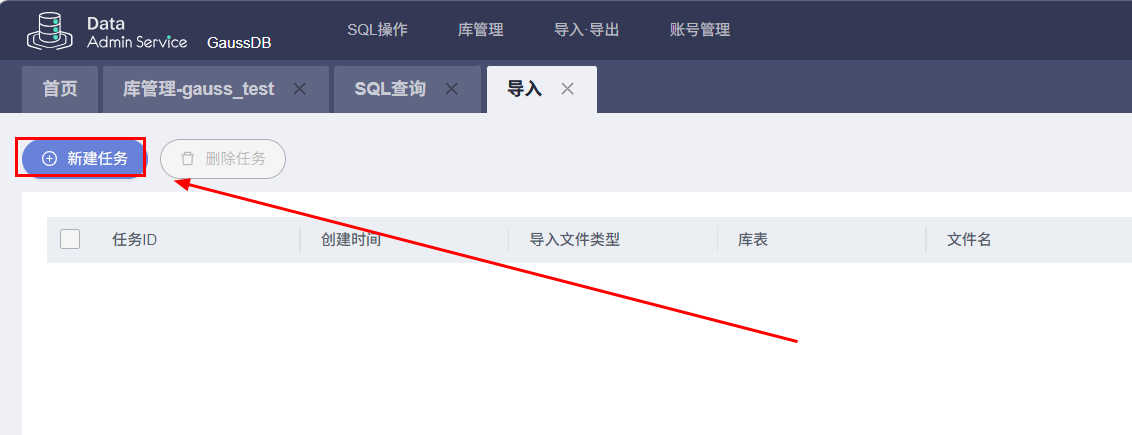 在GaussDB的DAS工具上面任务栏中 导入.导出 点击进入数据导入界面。
