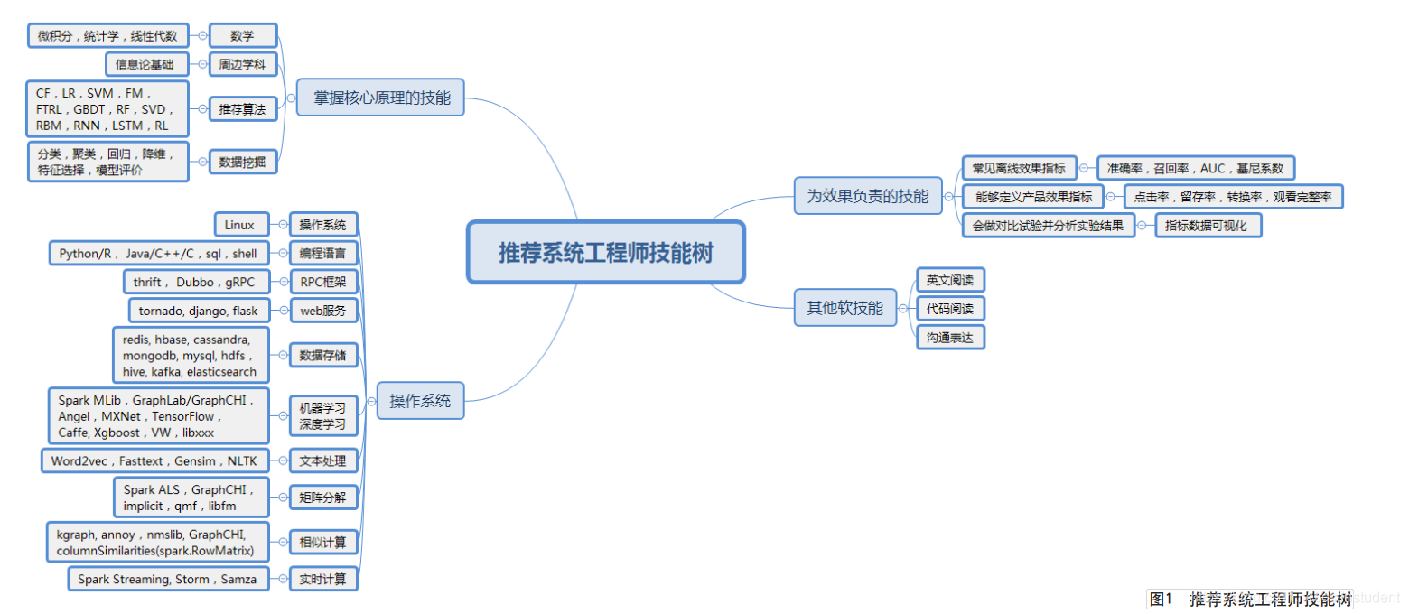 能够看懂一些经典论文对于实现系统非常有帮助:从基本假设到形式化定义,从推导到算法流程,从实验设计到结果分析。这些要求我们对于微积分有基本的知识,有了基本的微积分知识才能看懂梯度下降等基本的优化方法。概率和统计知识给我们建立起一个推荐系统工程师最基本的三观:不要以是非绝对的眼光看待事物,要有用不确定性思维去思考产品中的每一个事件,因为实现推荐系统,并不是像实现界面上一个按钮的响应事件那样明确可检验。大数据构建了一个高维的数据空间,从数据到推荐目标基本上都可以用矩阵的角度去形式化,比如常见的推荐算法: 协同过滤、矩阵分解。而机器学习算法,如果用矩阵运算角度去看,会让我们更加能够理解“向量化计算”和传统软件工程里面的循环之间的巨大差异。高维向量之间的点积,矩阵之间的运算,如 果用向量化方式实现比用循环方式实现,高效不少。建立这样的思维模式,也需要学好线性代数。