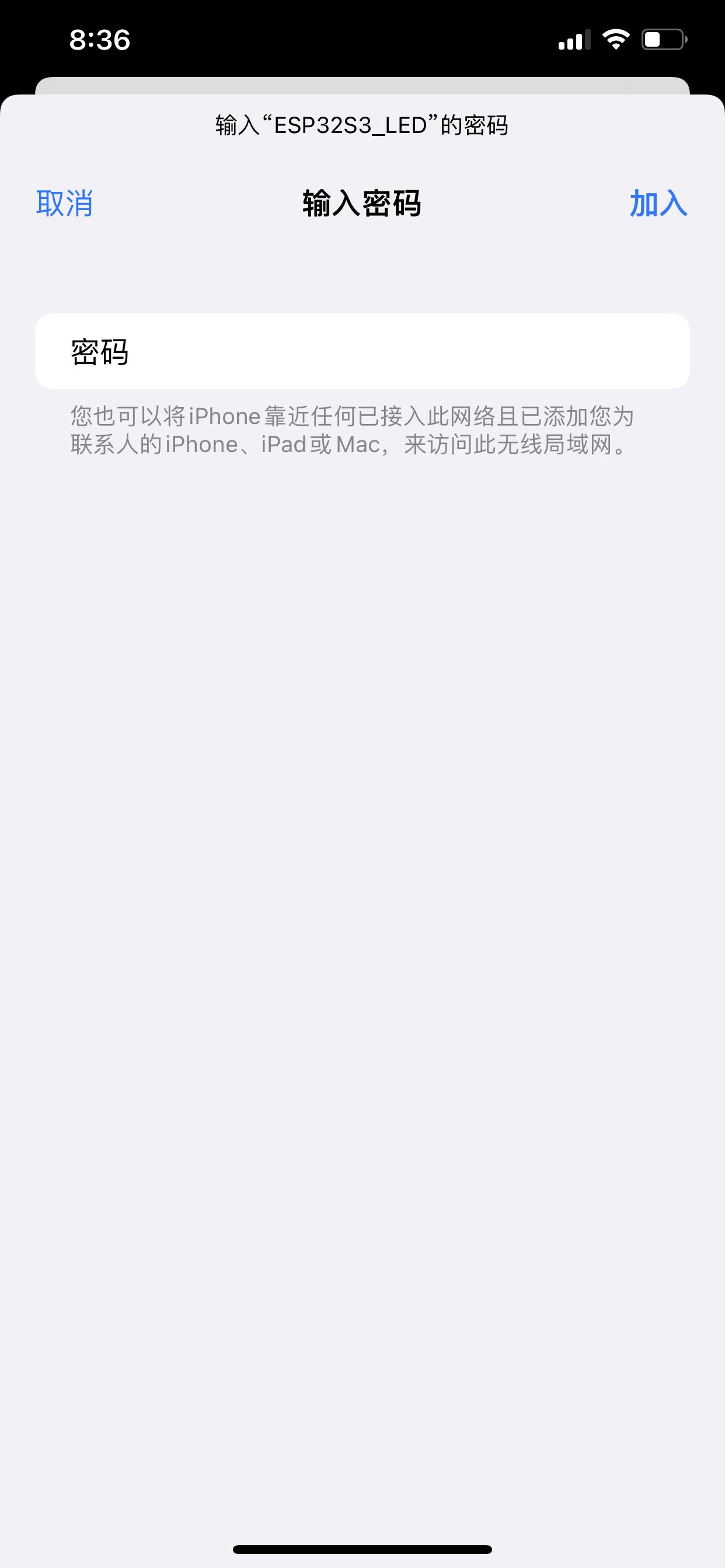在无线局域中找到ESP32S3_LED,输入密码 12345678 进行连接: