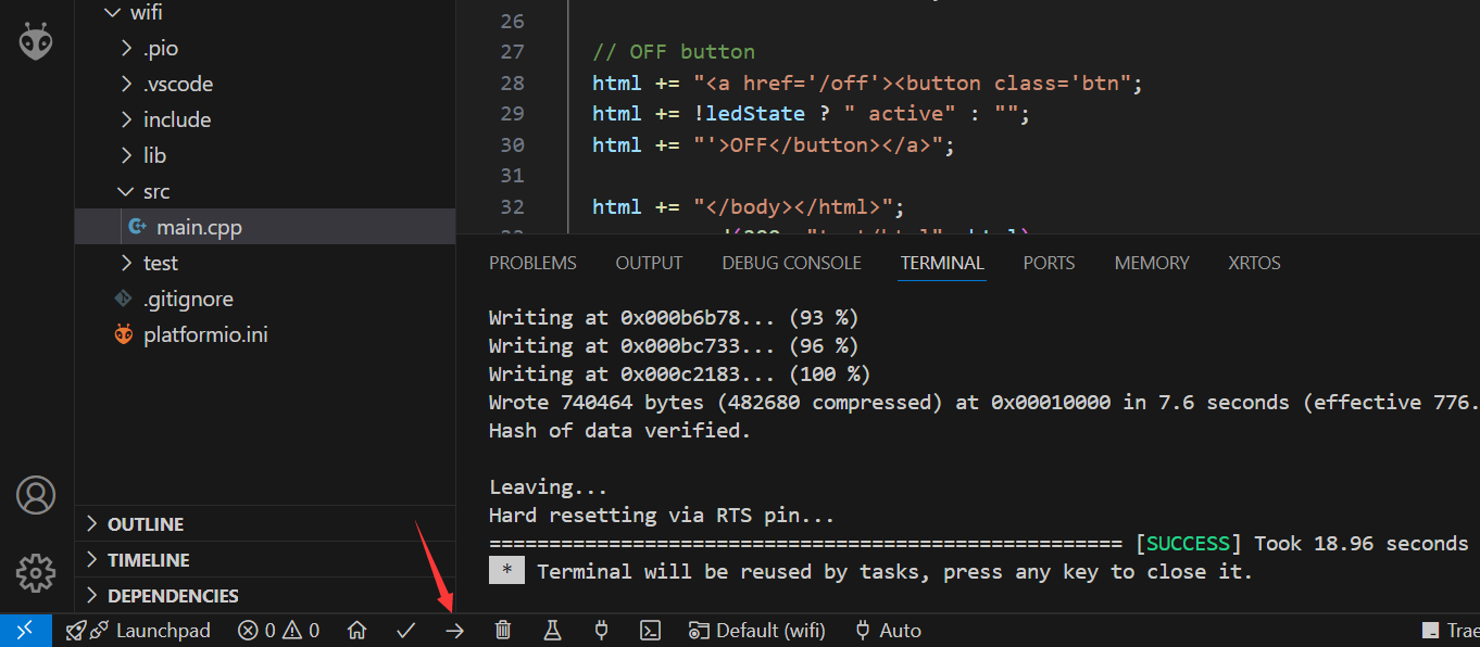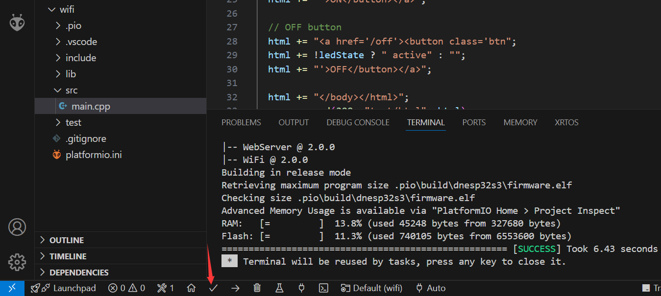 - 生成网页,显示两个按钮(ON/OFF),根据 LED 当前状态高亮对应按钮。