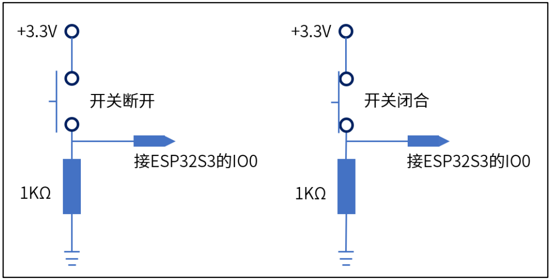 当按键开关断开时,即没有被按下时,ESP32S3 的 IO0 通过电阻和地相连接,产生低电平,