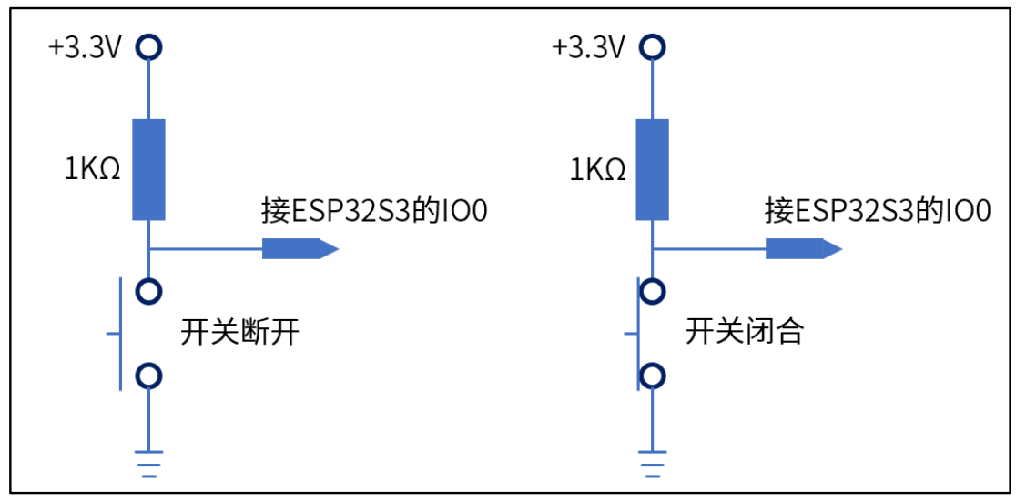 当按键开关断开时,即没有被按下时,ESP32S3 的 IO0 通过电阻和 3.3V 电源相连接,产生