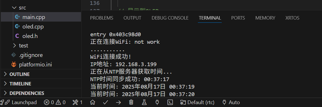 3. 修改main.cpp:包含ESP32Time库,初始化RTC,并在循环中更新时间并显示。
