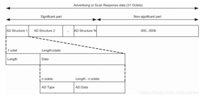 广播数据/扫描应答数据一个个的AD Structure组成,未满31bytes的数据由0填充;每个ADStructure有1byte的长度信息(Data的长度),和剩余的Data组成。