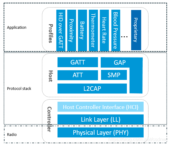主机部分包括:L2CAP逻辑链路控制和自适应协议层(Logical Link Control and Adaptation Protocol),安全管理层(Security Manager),ATT属性协议层(Attribute Protocol),GAP通用访问配置文件层(Generic Access Profile),总协定通用属性配置文件层(Generic Attribute Profile)