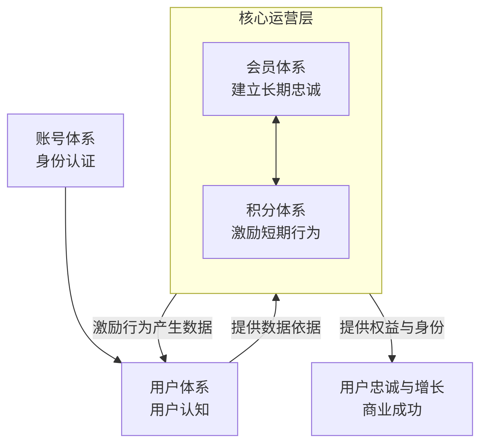 用户体系(发现痛点)→ 积分体系(激励行为)→ 会员体系(提供价值)→ 用户体系(更新画像)