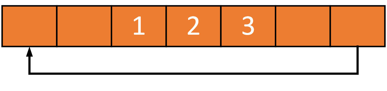 先不要想环形缓冲区(ring buffer)的具体实现细节,来看一个简单的例子。如下是一个空间大小为 7的环形缓冲区,其中底部的单线箭头表示“头尾相连”形成一个环形地址空间: