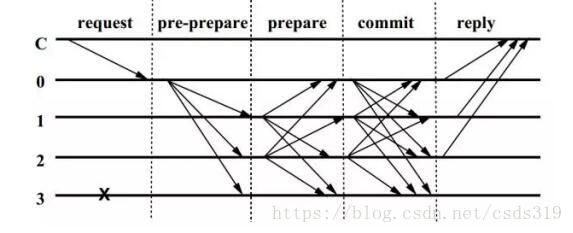 这张图表示的是BFT的共识步骤,C可以表示为节点0的client,0,1,2,3代表BFT节点,其中3为offline节点