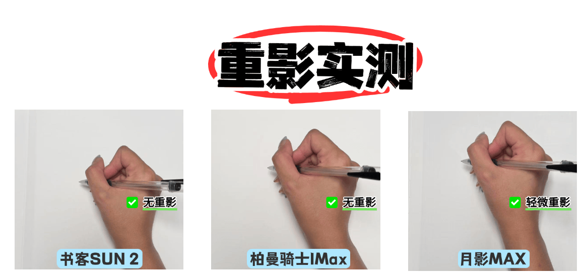 从上图中我们可以很明显的看到是否存在重影,并且在图片下方我也总结了重影程度,其中书客、柏曼这两款几乎无重影,特别是书客这款护眼灯,在实际体验中的舒适感更好,书客采用自研SunShell360°立体光场,配合SunPath多维漫射技术,360°环绕式侧发光,并且结合上下3:1的光通量比例,能够呈现有效减少重影的同时,实现360度舒适均匀的光线。