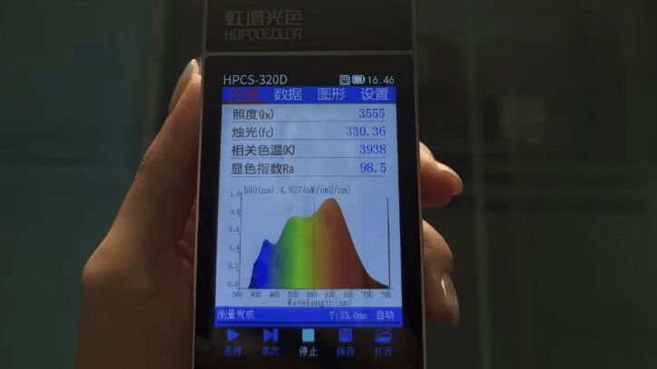 实测方法:为进一步精准光谱分布,我们将在没有其他灯光的状态下,采用光谱仪器实测相同灯光状态下的护眼灯。