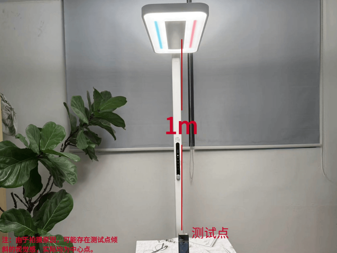 在无其他光源的环境下,将护眼大路灯调节到最高亮度,在发光面中心点垂直向下1m,为测试点,采用照度仪器实测出中心照度。
