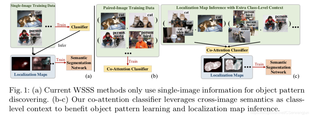 当前的WSSS模型通常仅使用单图像信息识别物体模式,而忽略了弱注释数据中的丰富语义上下文。例如,利用图像级标签,不仅可以识别每个单独图像的语义,而且它还给出了跨图像语义关系,即两个图像是否共享某些语义。这种跨图像的语义信息其实可以作为物体模式挖掘的有用线索。