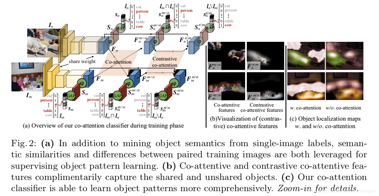 与研究共同语义作为促进物体模式挖掘的信息线索的共同注意相比,对比共同注意从配对图像之间的语义差异解决了互补知识。图2(b)给出了一个直观的例子。对比共同注意能帮助图像更好的区分不同的语义对象。因为两张图片的共同部分和非共同部分被解耦,这可以使得分类器能更好的关注图片的不同部分。比如说,两张图片中都有人,某张图片有只牛,对比共同注意在拿掉人的时候,同时可能也拿掉了分类器错误识别的牛的某部分(被认为是人),剩余的牛的部分足够分类器的去分类,分类器不会被误识别的部分干扰。