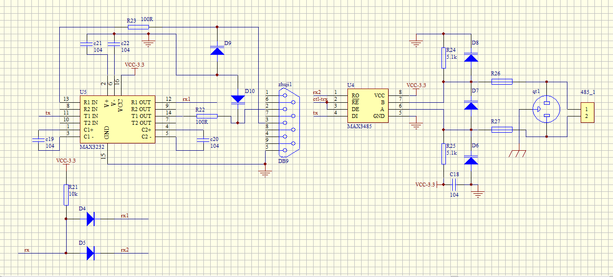 - 接口复用技巧:RS232 和 RS485 共用 CPU 的 RX 脚,通过 1N5819 肖特基二极管(D4、D5)+10K 上拉电阻(R21)实现,无需额外占用 IO 口,简化硬件结构;