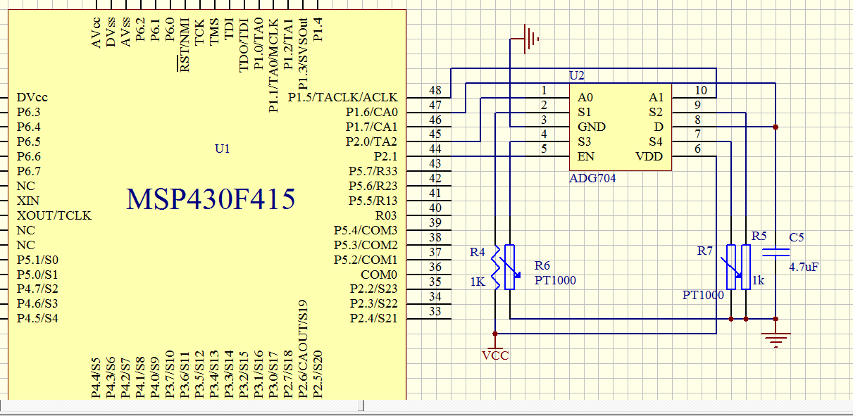 - U2 (ADG704):这是电路成功的关键器件。我们放弃了通用的CD4051这类器件,因为其几百欧姆且不稳定的导通电阻会直接影响微小的PT1000阻值变化。ADG704的导通电阻仅约2Ω,且温漂极小,也可以使用4个单路开关如SN74CBT1G125等,但占用板子面积会大一些。