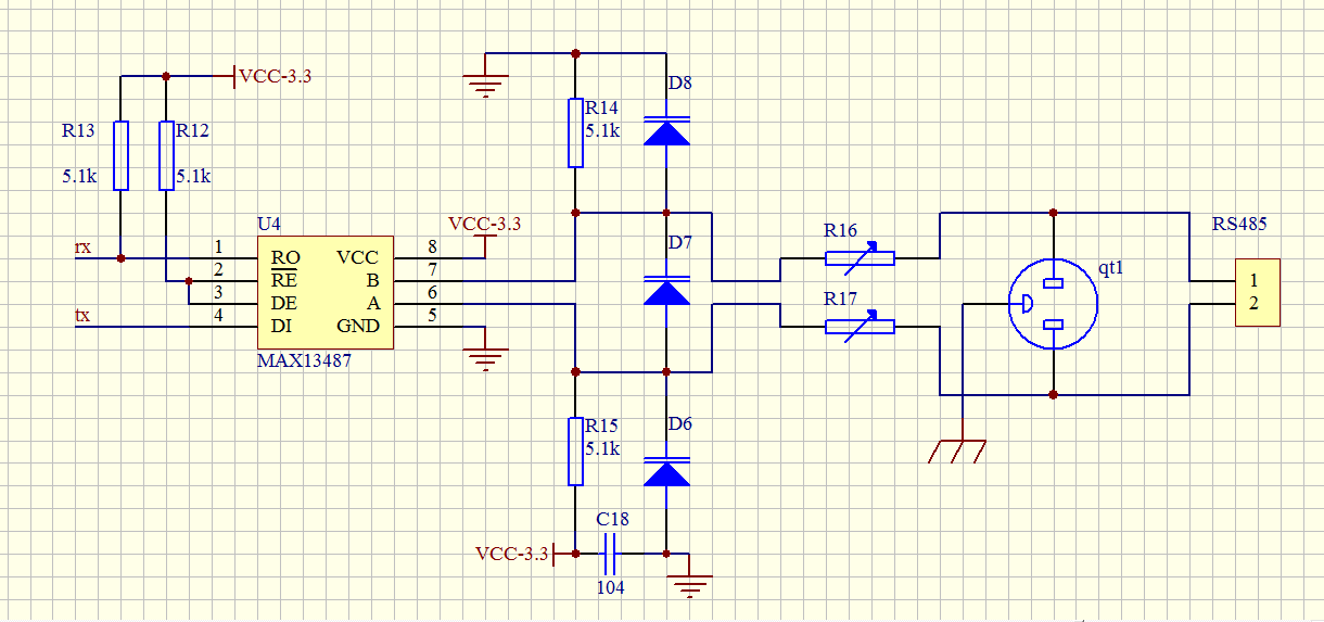 - 上拉电阻:R12、R13(4.7kΩ–10kΩ)用于稳定收发控制与接收引脚电平。