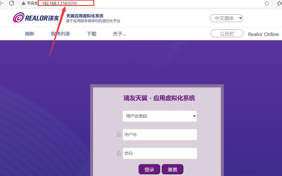在外网的浏览器的地址栏输入nat123映射好的外网域名地址和外网端口就可以访问本地部署的瑞友天翼虚拟化系统登录界面了。
