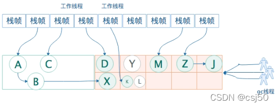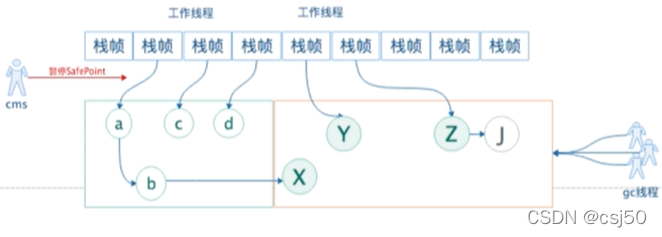 (2)gc线程,采用多线程,从GCRoot 标记直接可达的对象(XYZ)。CMS是老年代回收器,所以只标记老年代的。
