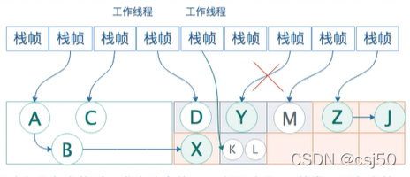 (2)工作线程继续运行,旧的栈帧就出栈,出栈后老对象就死亡,即存活对象转变为垃圾对象。