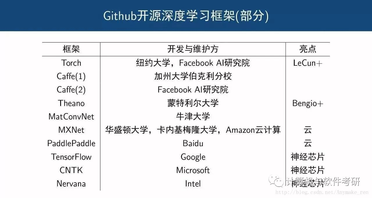 随着深度学习的发展,为了方便算法人员训练模型,调整参数等,很多公司开源了优秀的深度学习框架,到目前为止,主要的深度学习框架如下图所示。目前工业界用的比较多的是 Caffe 和 TensorFlow,Caffe 主要在计算机视觉上用的较多,TensorFlow 由谷歌开源,相关文档较好,适用范围广,基于 Python 语音,入门简单,建议新手入门可以选择 TensorFlow。但是这些只是深度学习的平台框架而已,真正重要的还是学习好深度学习的理论,有了理论各种平台都不是问题。